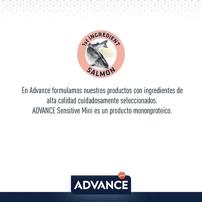 Su fórmula monoprotéica, con salmón como coma única fuente de proteína animal y con arroz hacen de Advance Sensitive Mini un alimento fácil de digerir e ideal para perros con sensibilidad digestiva.